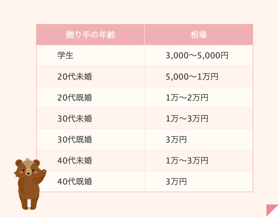 5,000円~30,000円程が一般的なようです。範囲が広い理由としては、贈る側の年齢等が関係しています。内訳は表の通りです。